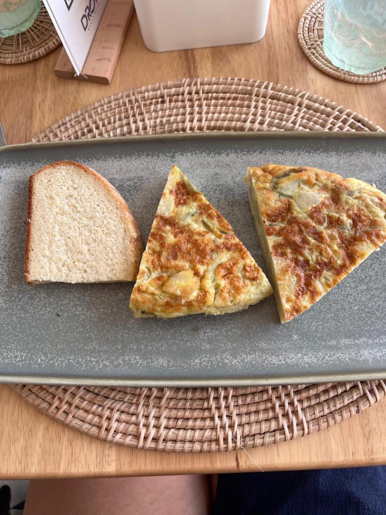 Recomendamos la tortilla de papas al estilo española del Restaurante Drop Beach Club, un lugar sencillo pero con todo lo necesario para completar la experiencia de un día de playa bien relajante.