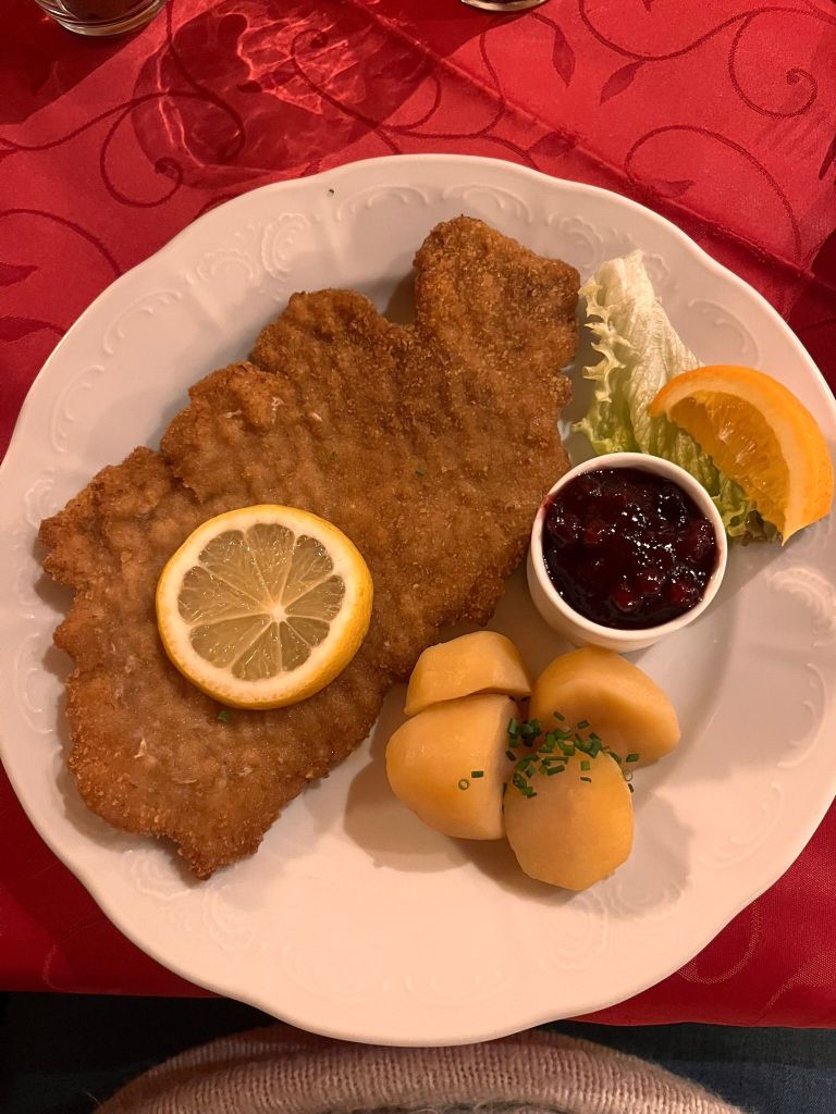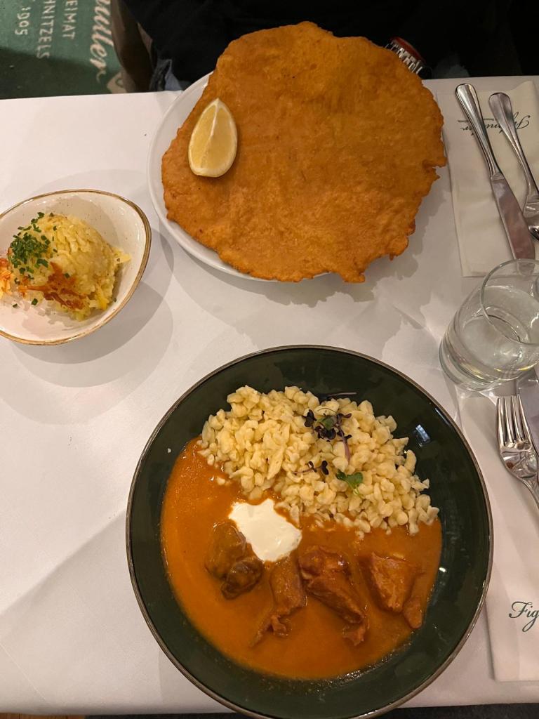 Por la noche, fuimos a probar el restaurante Figlmüller, donde podemos encontrar las schnitzels más grandes de Viena, las cuales son de cerdo y sobresalen del borde del plato. También probamos el goulash con spaezle y fue una maravilla. Gastamos unos €50 entre los dos, y nos costó terminar nuestros platos de lo abundantes que eran. Se recomienda reservar con anticipación!